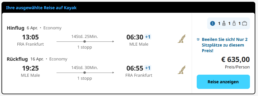 Der Rundflug Deal verzeichnet einen stattlichen Discount von mehr als 42% zum regulären Marktpreis der Route (FRA – MLE).