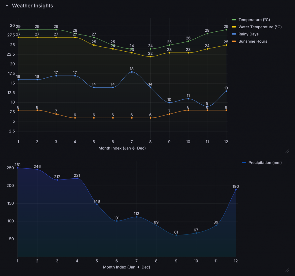 Der November gehört zur besten Reisezeit des Jahres. Mit gerade einmal 89 mm Niederschlag ist regnerisches Wetter die absolute Ausnahme. Konstant hohe Wasser- und Außentemperaturen laden zum Baden ein.