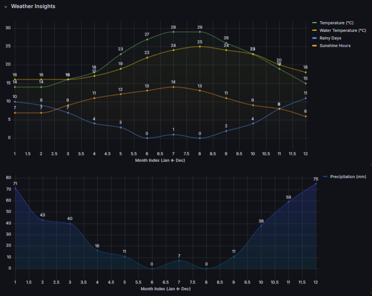 Der Juli/August gehört zur besten Reisezeit des Jahres. Mit gerade einmal 0-7 mm Niederschlag ist regnerisches Wetter die absolute Ausnahme. Konstant hohe Wasser- und Außentemperaturen laden zum Baden ein.