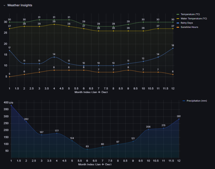 Der Juni gehört zur besten und zugleich niederschlagärmsten Reisezeit des Jahres. Mit gerade einmal 63 mm Niederschlag ist regnerisches Wetter die absolute Ausnahme. Konstant hohe Wasser- und Außentemperaturen laden zum Baden ein.
