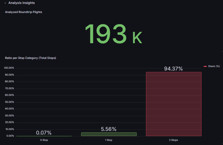 Gerade einmal 0.07% der Deals umfassen einen Direktflug für Hin- und Zurück. Die restlichen Deals haben mit mehr als 99% mindestens 1 Zwischenlandung auf die Reise betrachtet. Damit ist der Deal ein extrem seltenes Fundstück.